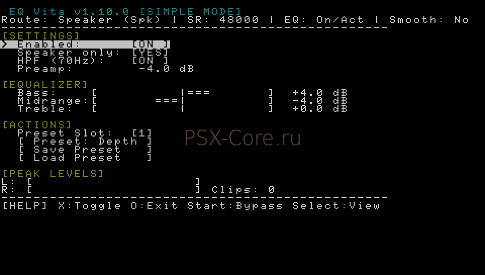 EQVita v1.10 - приложение-эквалайзер, управляющее частотными диапазонами всей аудиосистемы PS Vita. Системный 8-полосный графический эквалайзер для PS Vita (3.65 Ensō) с сопутствующим пользовательским интерфейсом.